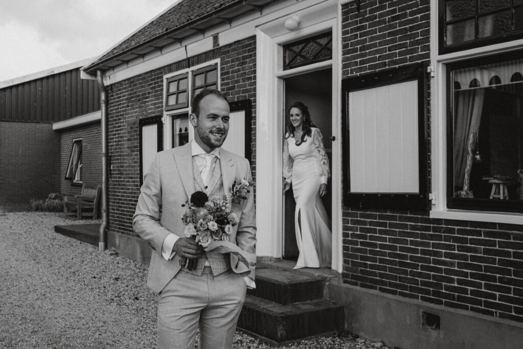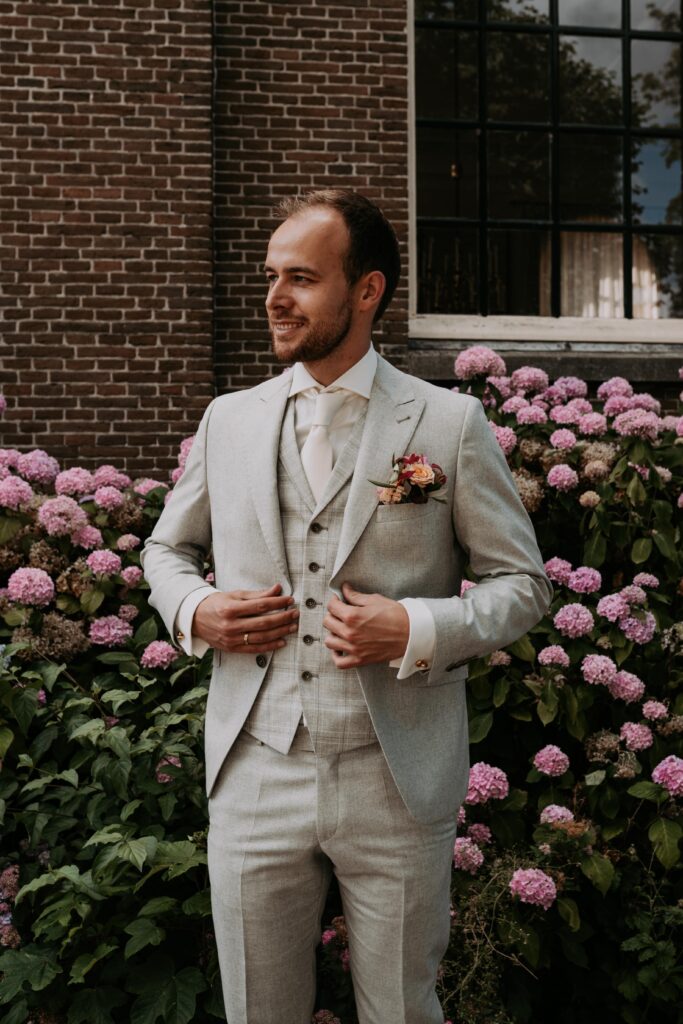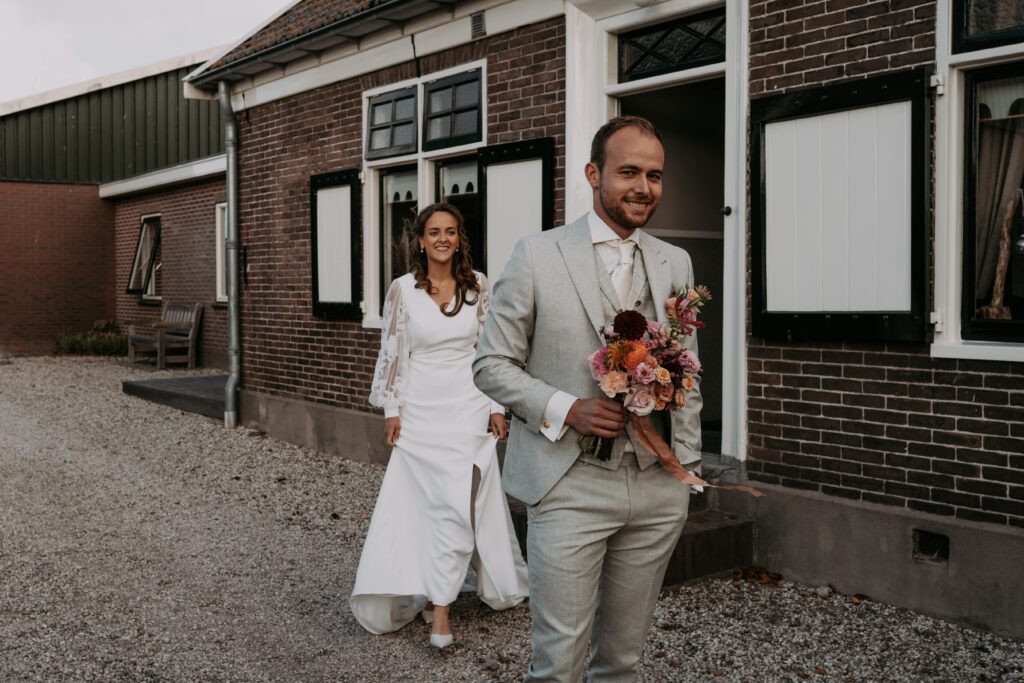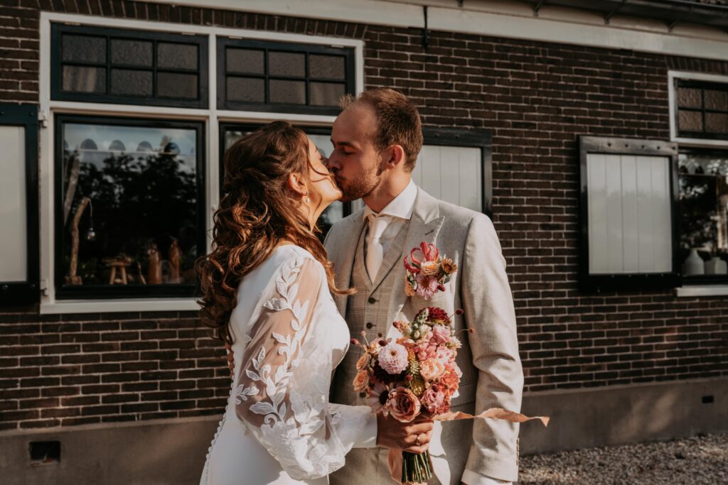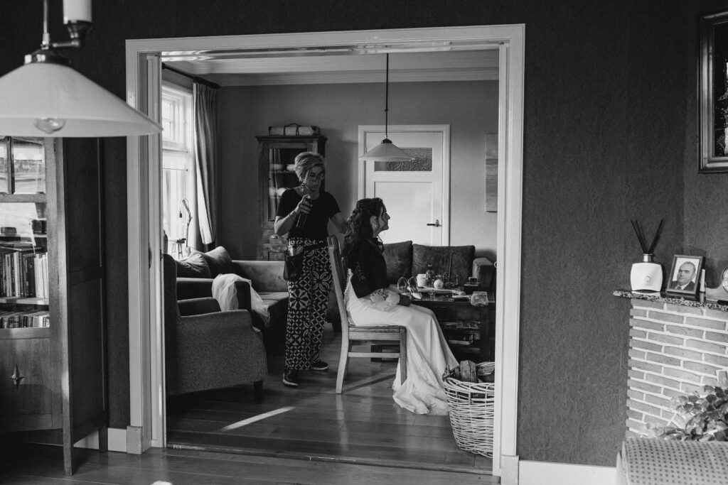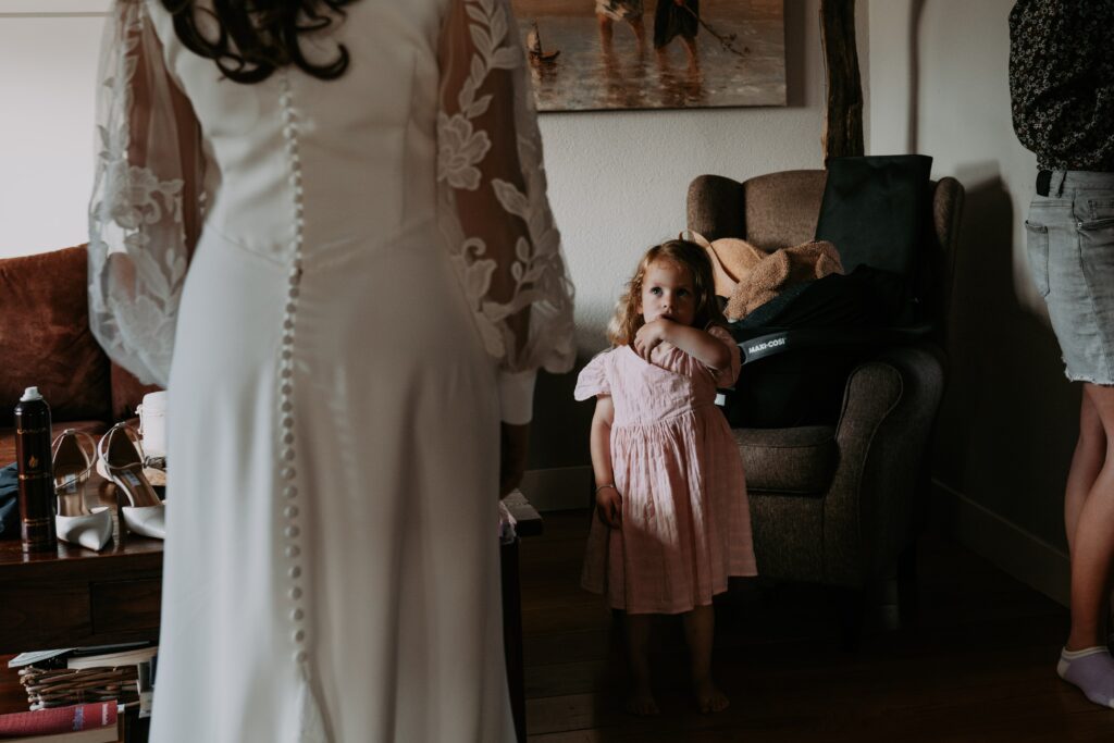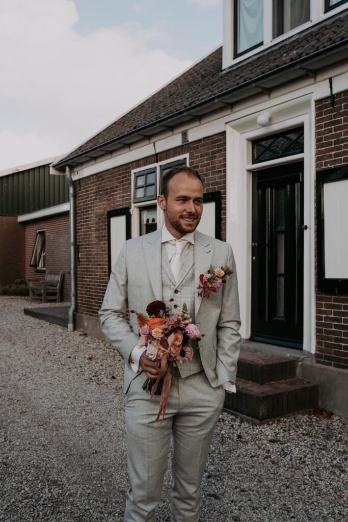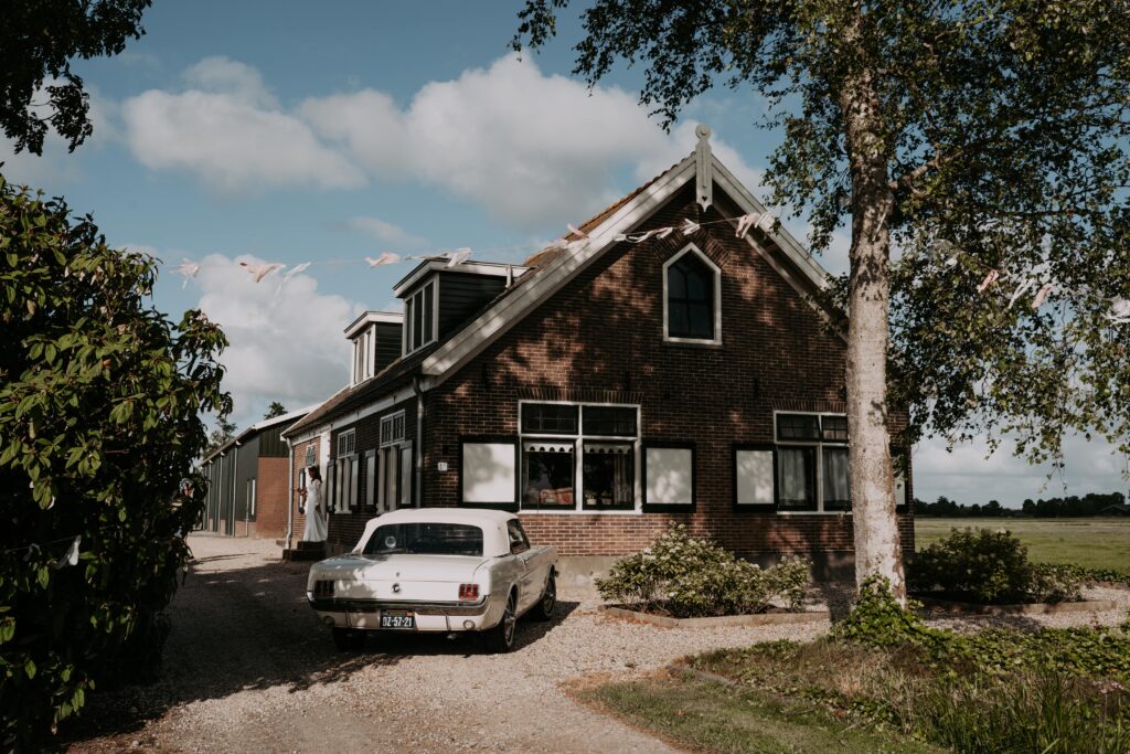 Ohhhh deze dag! Bij sommige bruiloften komt alles samen: de mensen, de sfeer, het weer… En dit was zo’n dag! We begonnen de dag bij de bruid op de boerderij. Het zonnetje scheen al lekker en er hing een heerlijke rust. De bruid werd in haar jurk gehesen (wat een waanzinnig mooie jurk!) en nu was het wachten op de bruidegom!