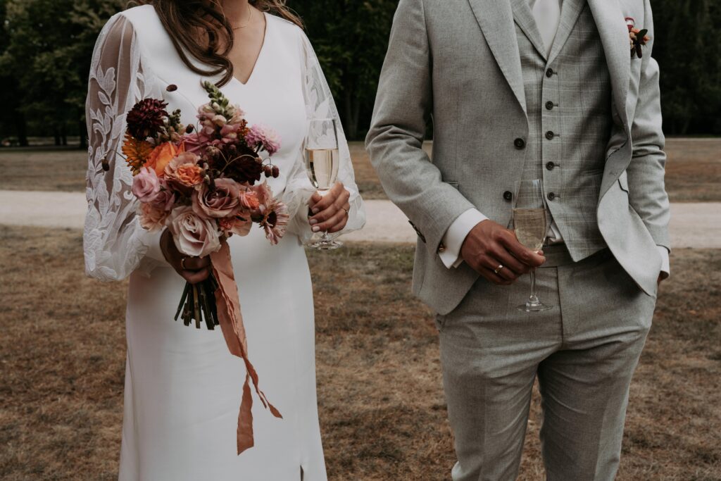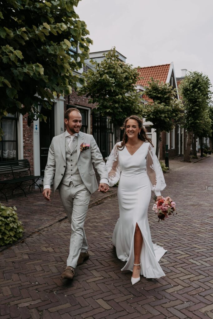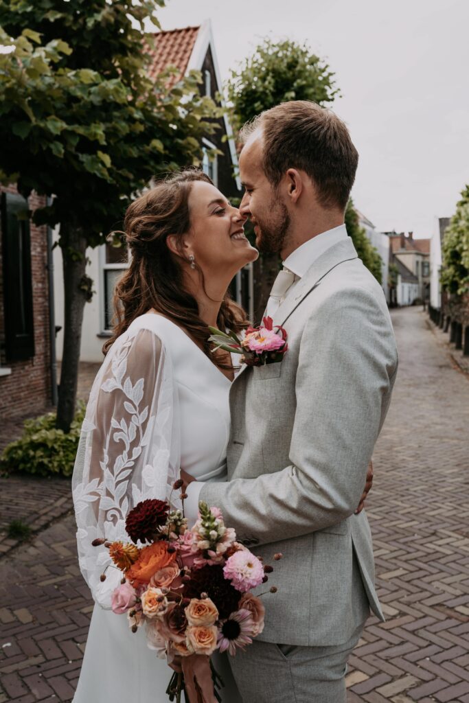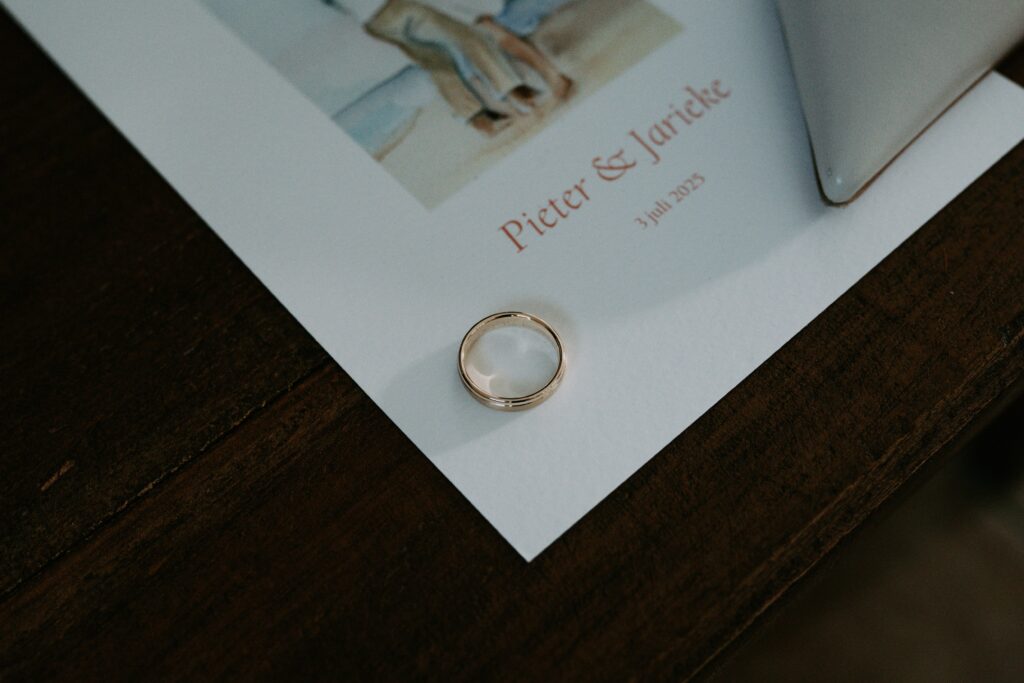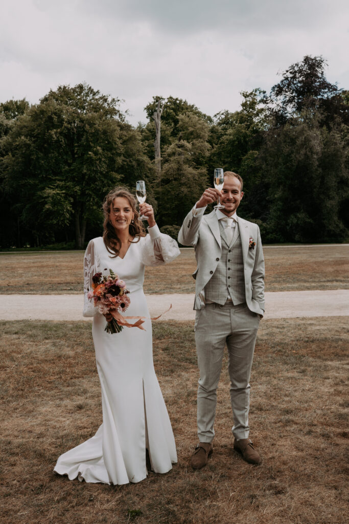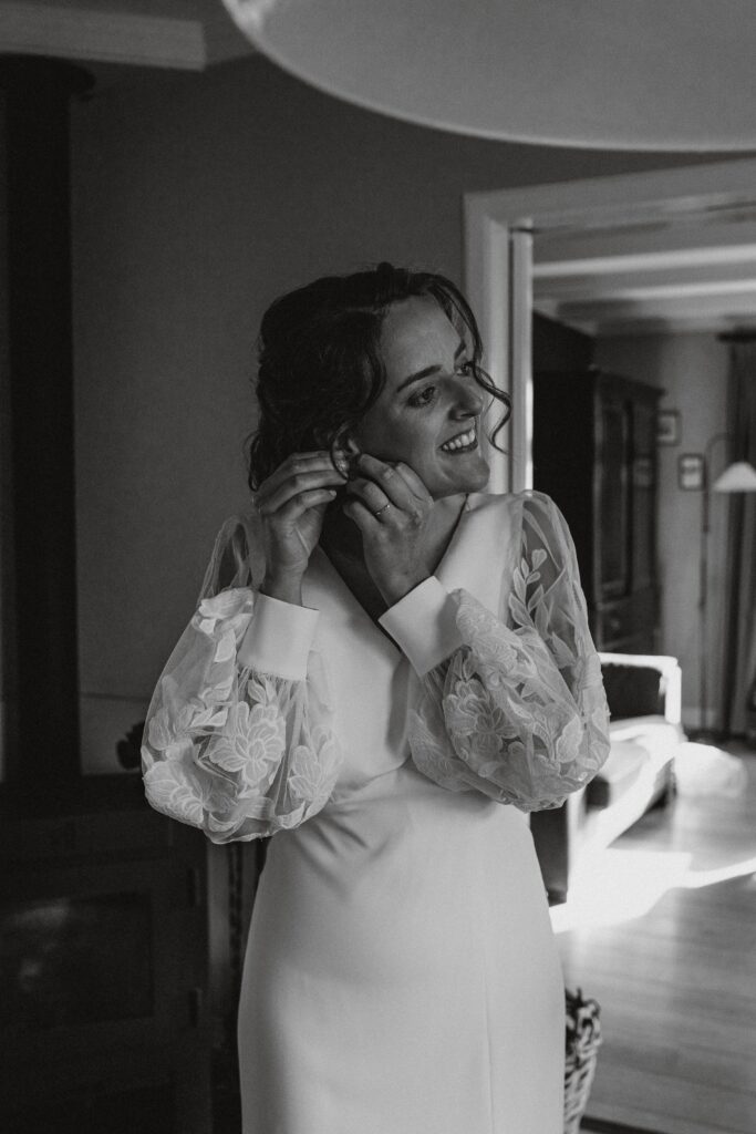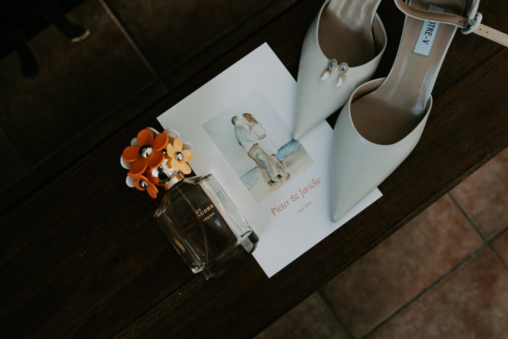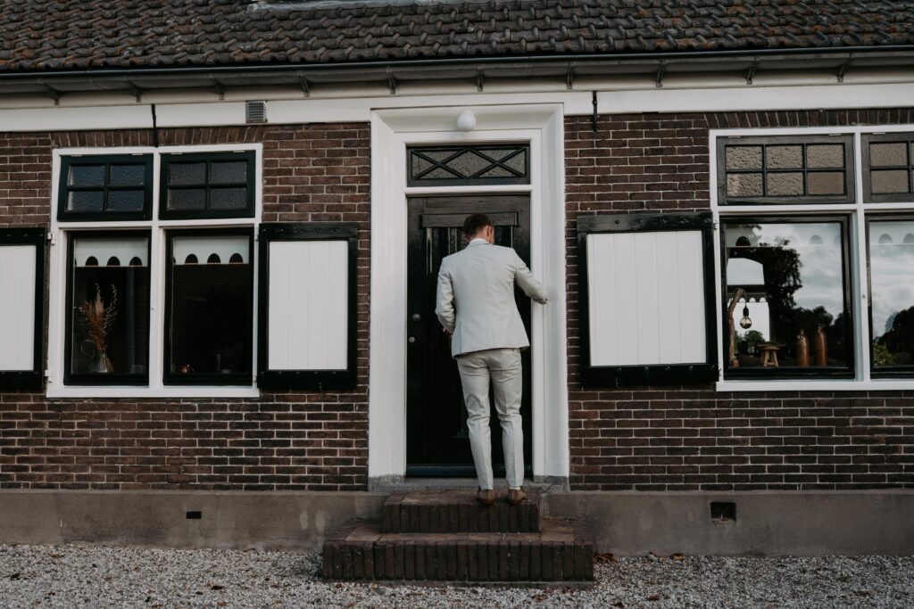 Ohhhh deze dag! Bij sommige bruiloften komt alles samen: de mensen, de sfeer, het weer… En dit was zo’n dag! We begonnen de dag bij de bruid op de boerderij. Het zonnetje scheen al lekker en er hing een heerlijke rust. De bruid werd in haar jurk gehesen (wat een waanzinnig mooie jurk!) en nu was het wachten op de bruidegom!