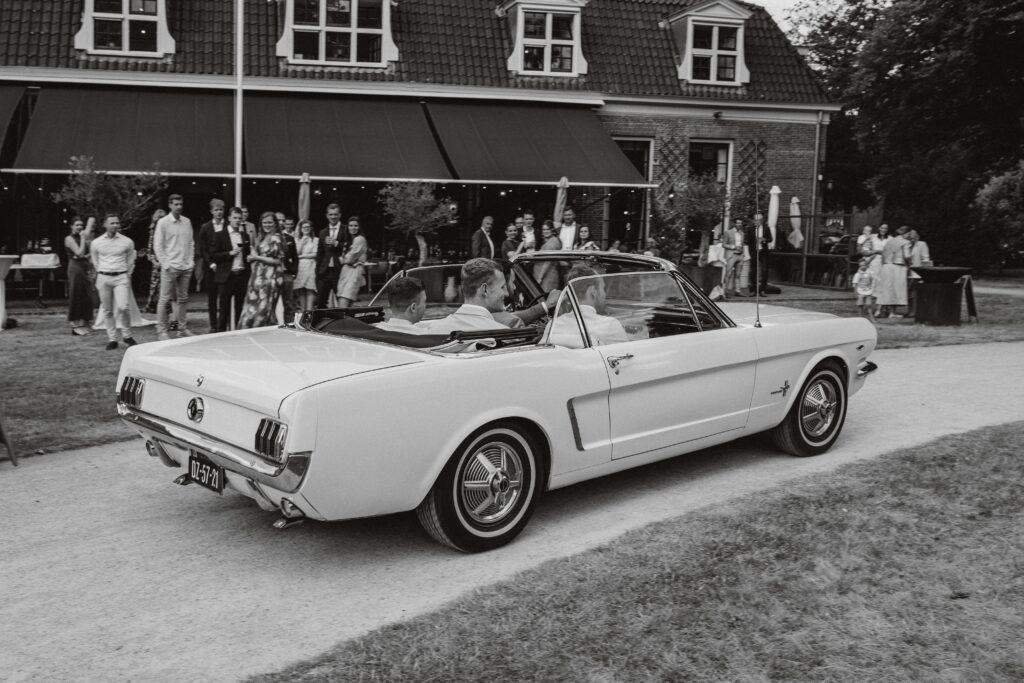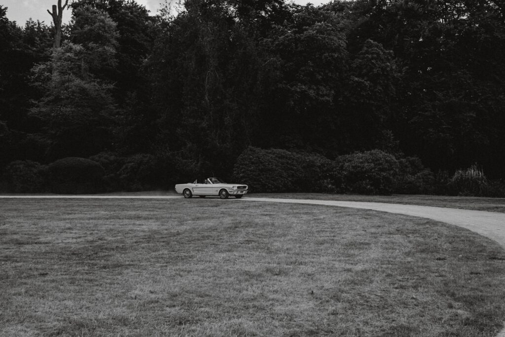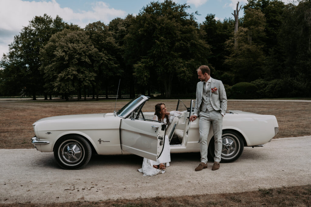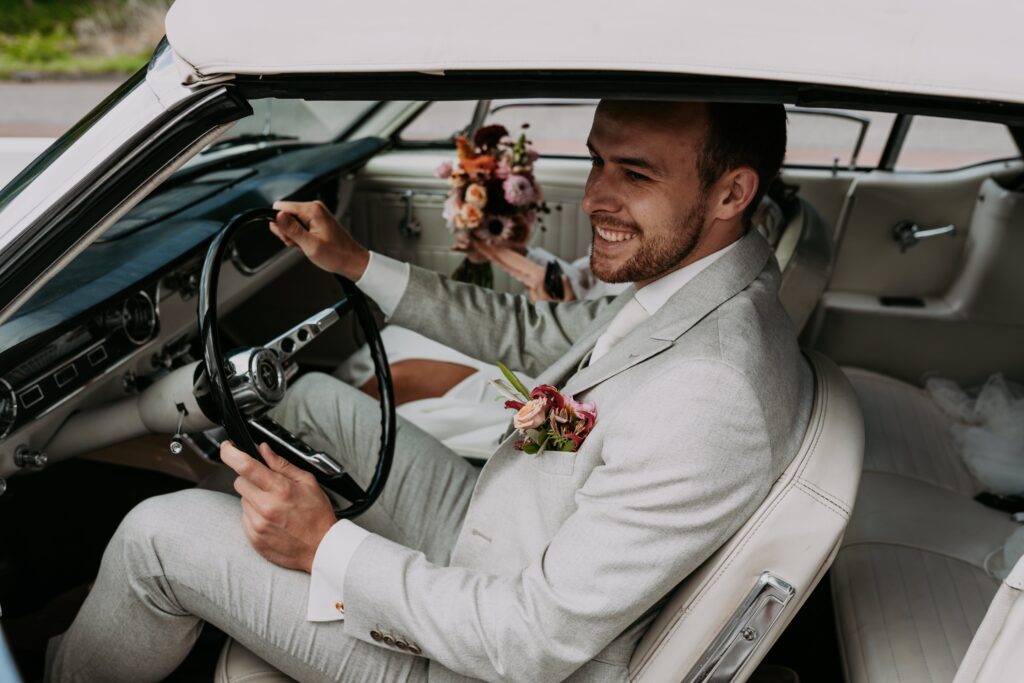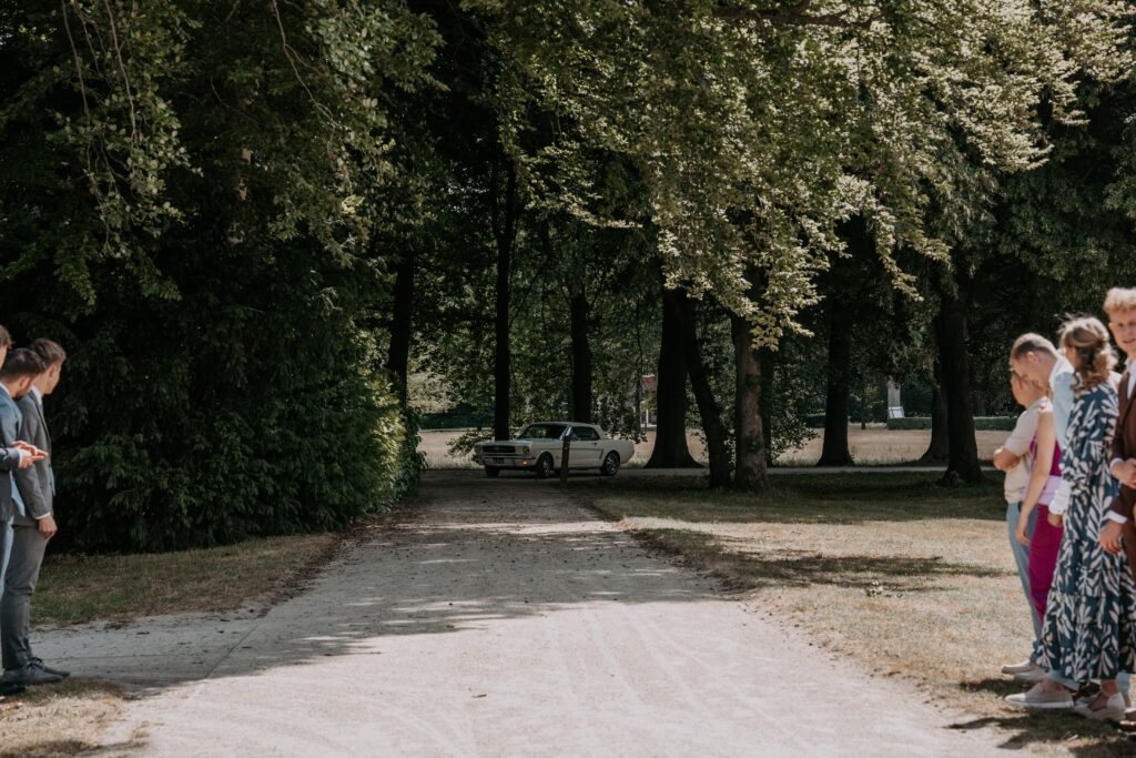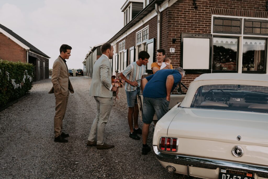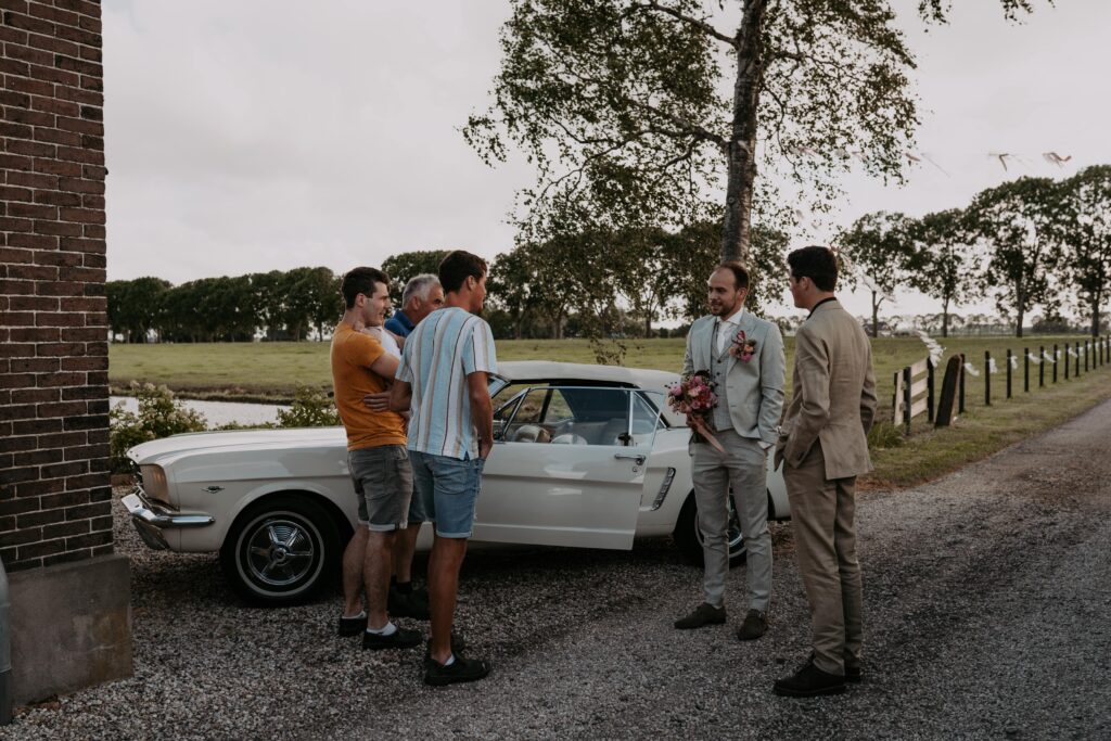 Niet veel later arriveerde de bruidegom in een witte Mustang (ja, zo eentje waarvan je meteen denkt: wauw). Alle mannen verzamelden zich natuurlijk om de auto en niet veel later was het tijd voor de first look. Prach-tig!