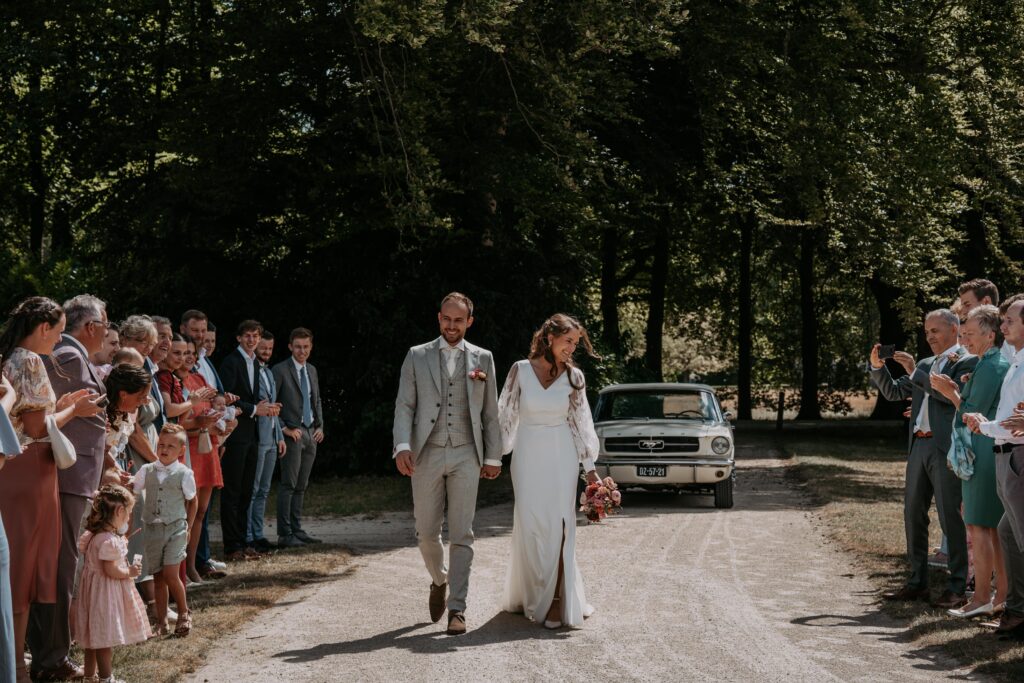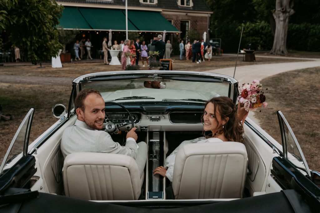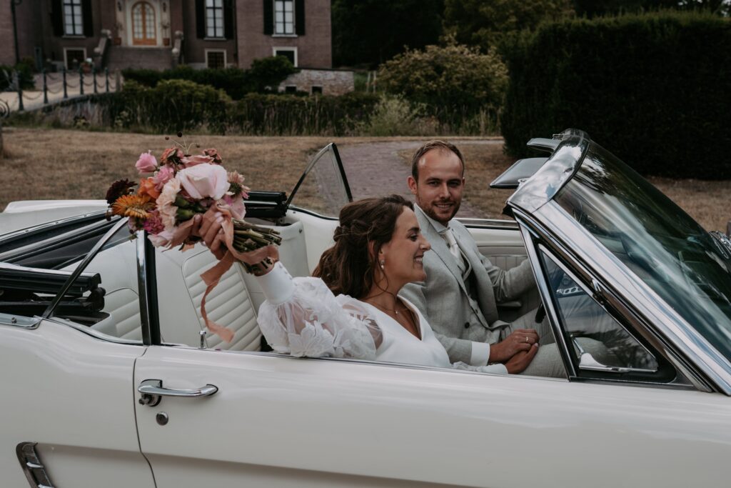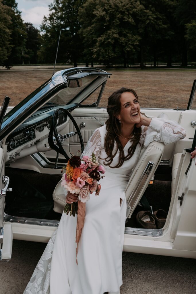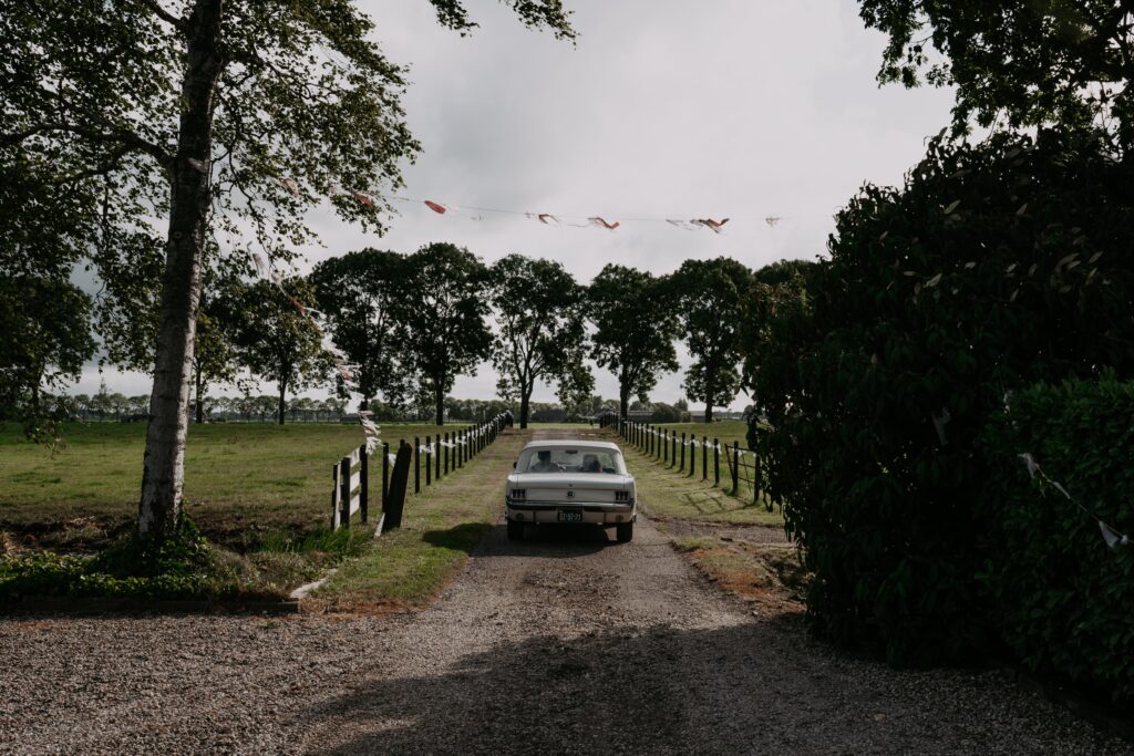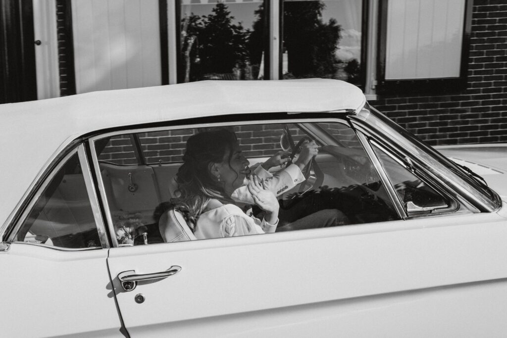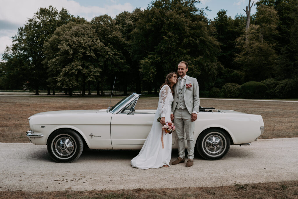 Niet veel later arriveerde de bruidegom in een witte Mustang (ja, zo eentje waarvan je meteen denkt: wauw). Alle mannen verzamelden zich natuurlijk om de auto en niet veel later was het tijd voor de first look. Prach-tig!