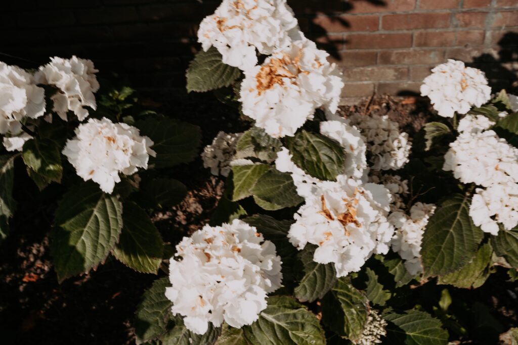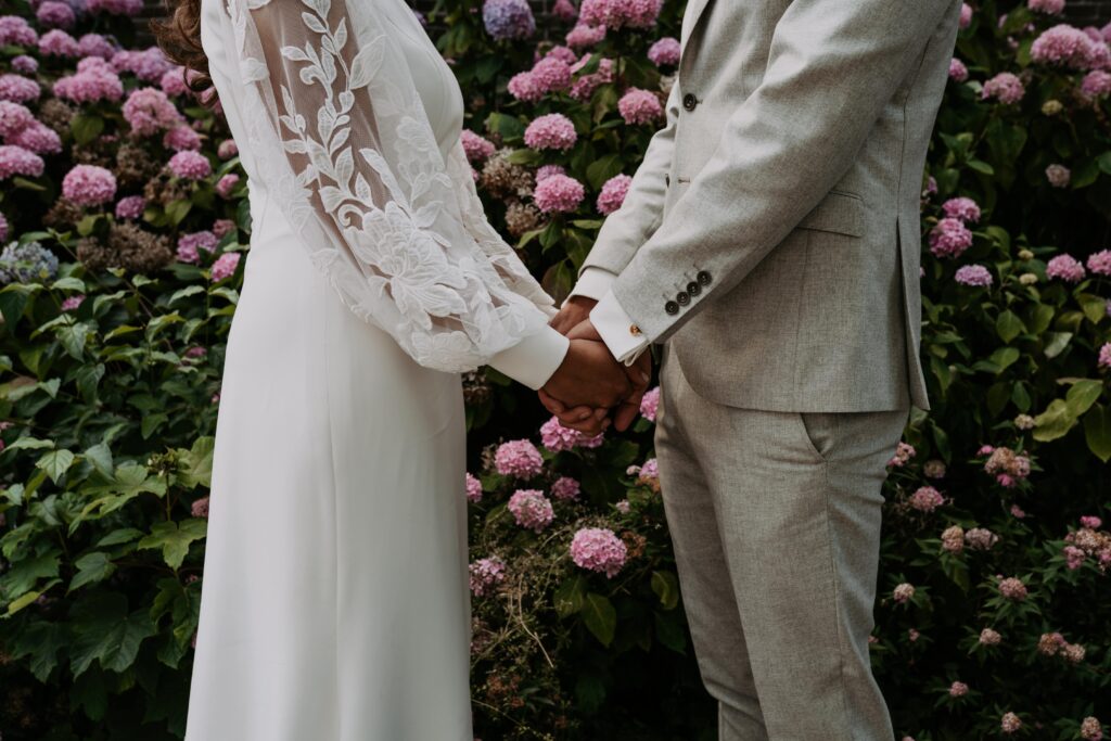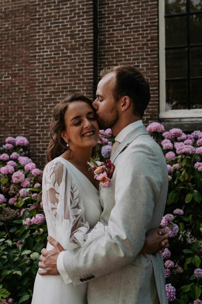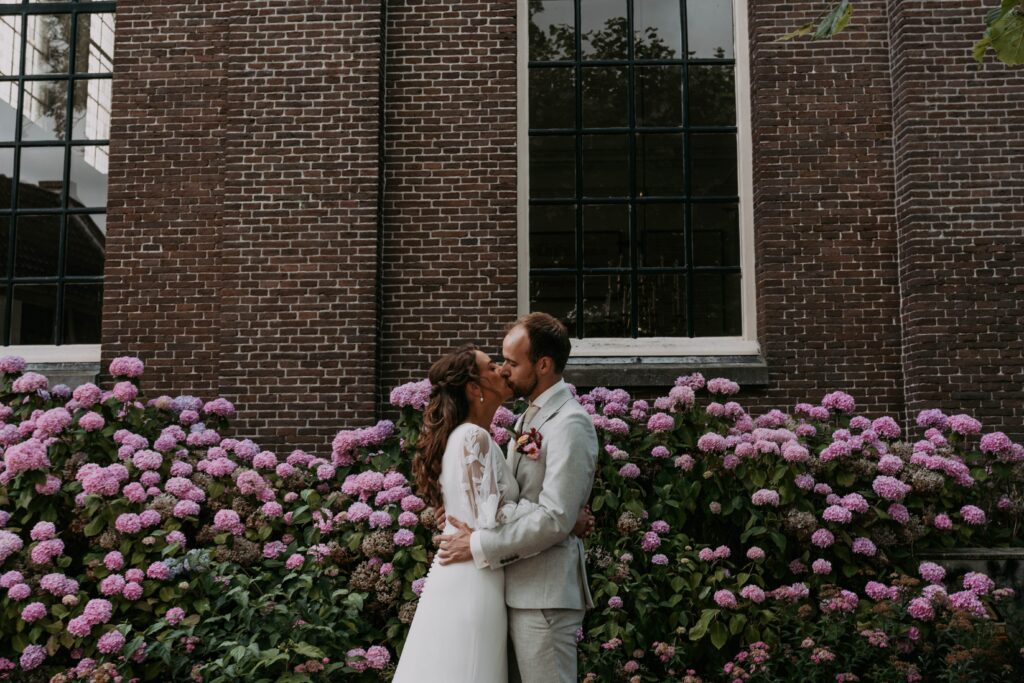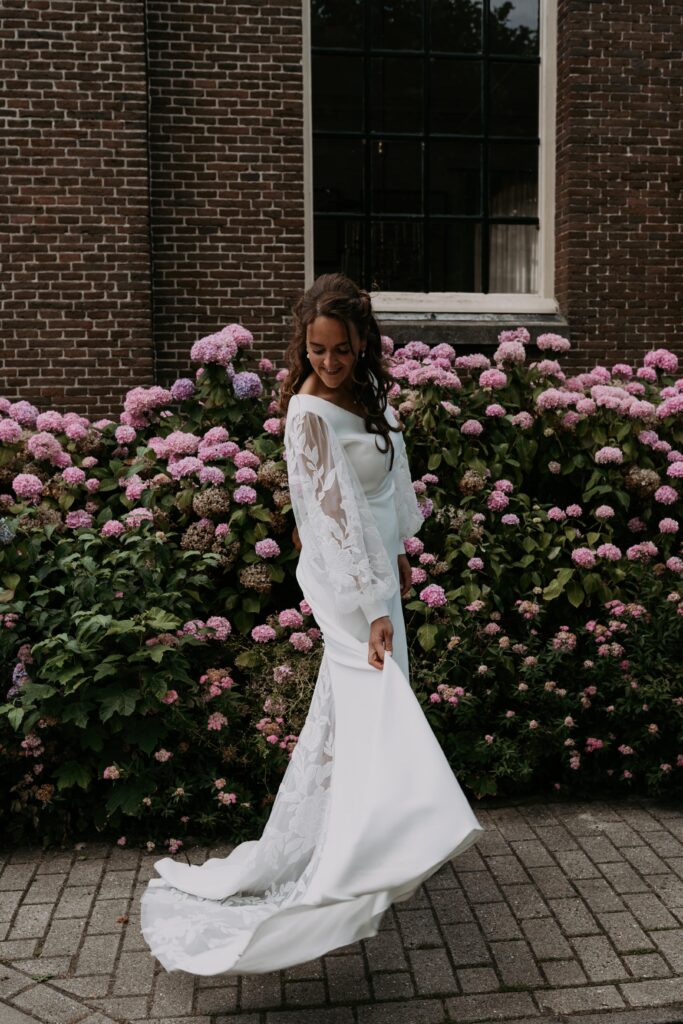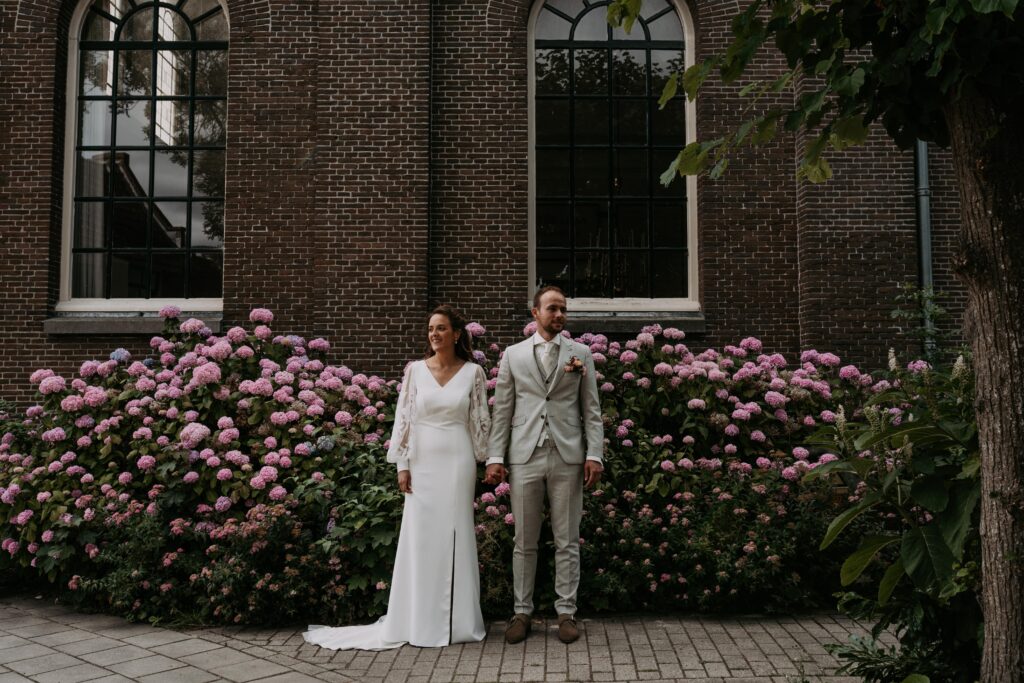 Voor de fotoshoot reden we naar een gezellig straatje in de buurt. Een dikke tip voor als je nog een locatie zoekt en je hebt geen idee waar. Zoek in de buurt een stadje of dorpje op met mooie straatjes (eigenlijk is 1 straatje dus al genoeg). En toen kwamen we ook nog langs een kerk met bloeiende hortensia’s ervoor, die konden we natuurlijk niet voorbij lopen zonder wat foto’s te maken!